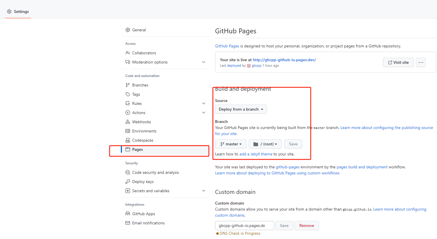回到 GitHub 博客仓库的 Settings 页面,在 Pages 子页面的 Custom domain 中填入 xxx-github-io.pages.dev 保存。以后每次访问自己的 xxx.github.io 便会自动跳转到 xxx-github-io.pages.dev。