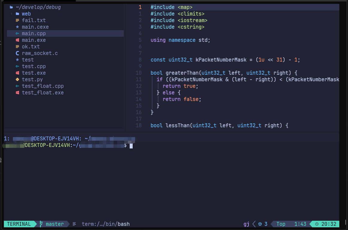 NeoTree和代码窗口中,使用Ctrl + h|l|j|k,即是 nvim 中移动光标位置的快捷键加上Ctrl键便是上下左右切换窗口的快捷键。